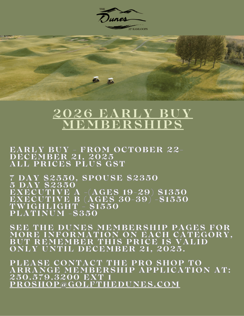 The Dunes at Kamloops is truly nature’s golf course. Lush fairways carve effortlessly through the sand, each leading to a meticulously kept green. Measuring 6973 yards in length, The Dunes caters to all levels of players with your choice of four tees. Regardless of whether you are swinging a club for the first time or a seasoned pro, our goal is to ensure your experience is incomparable from start to finish. Relax and Enjoy.