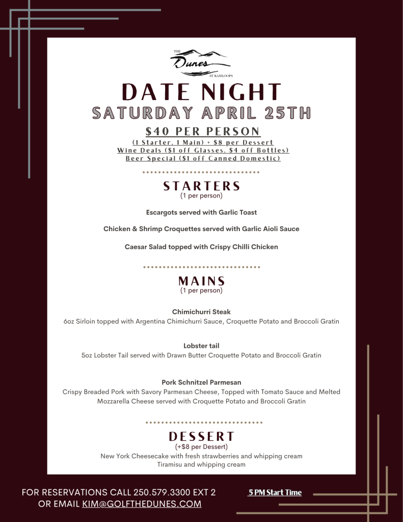 Come and enjoy a delicious meal, while sitting on our patio or just enjoying the views from our very bright and spacious restaurant. We are currently on winters hours. Please see below for all the exciting things currently offered in the restaurant.